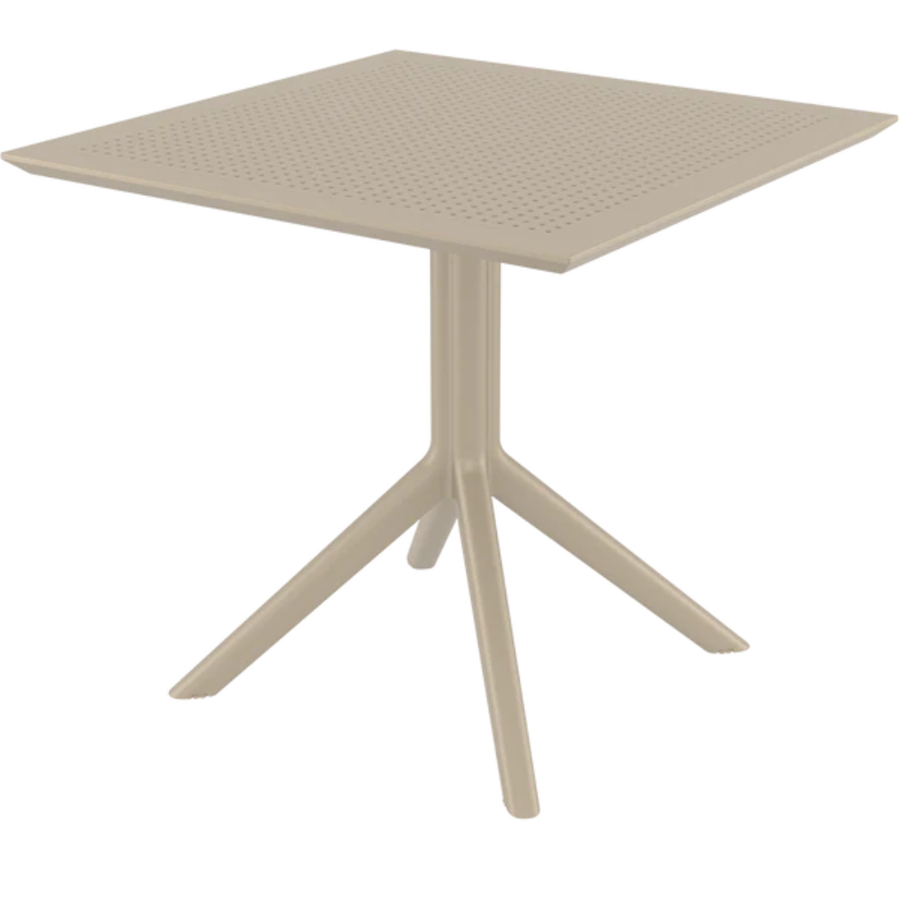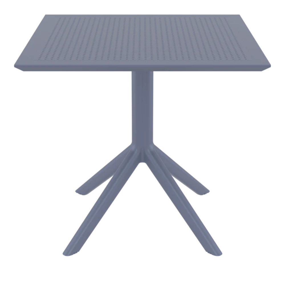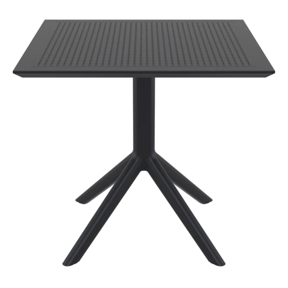 Esta mesa cuenta con un tamaño de 80 cm de ancho, 80 cm de fondo y 75 cm de altura y es perfecta para cuatro puestos. Fabricada en resina con fibra de vidrio y aluminio, es resistente y duradera para todo tipo de clima.